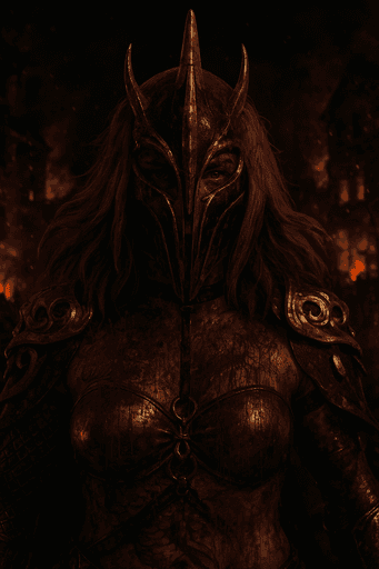 BENEATH HER HELM, HER GAZE IS DEATH'S PROMISE.